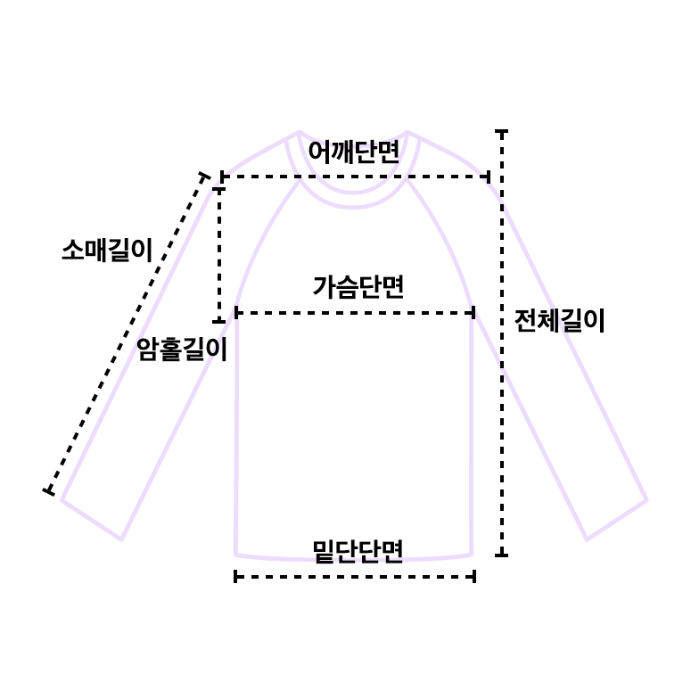| Size (cm) | 어깨 | 가슴 | 암홀 | 소매 | 밑단 | 총장 |